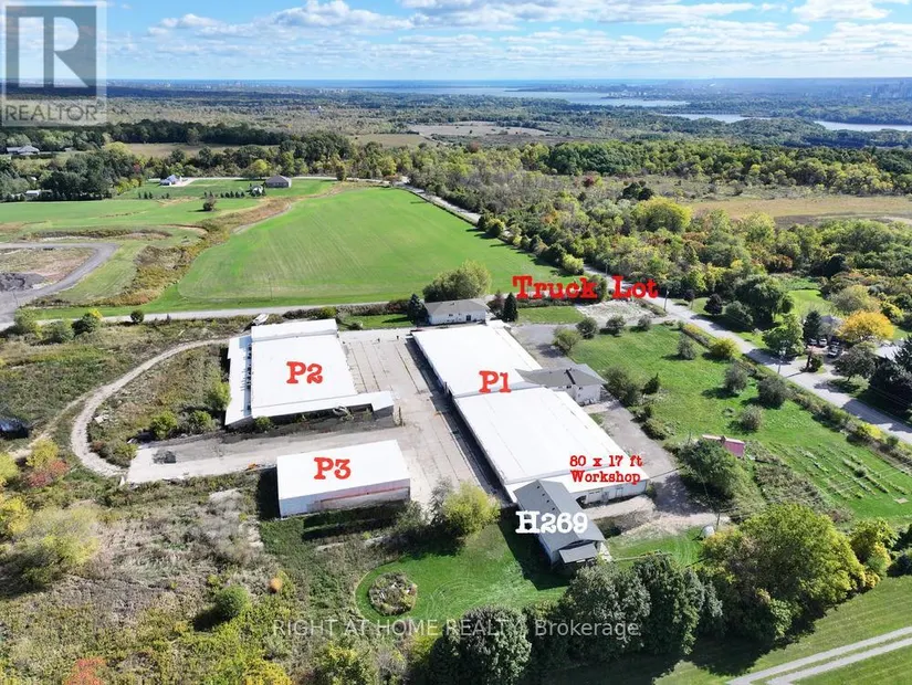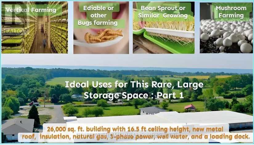 Located in the highly sought-after Flamborough area, this property provides convenient access to Highway 5, Highway 6, the 403, the City of Hamilton, and the Greater Toronto Area, making it an ideal location for a variety of business operations. The barn boasts 26,000 square feet of space with a generous 16.5-foot ceiling height. It features a brand-new metal roof, full insulation, and is equipped with 3-phase power, natural gas, well water, and a durable concrete floor. Additionally, it includes a loading dock for easy access and logistics. The interior of the barn is designed with removable walls, offering flexibility to adapt the space for a range of purposes, including storage, vertical farming, mushroom cultivation, bean sprout production, edible insect farming etc. Additional Details: 1. The barns existing structure allows tenants to modify or customize the interior based on their specific needs, at their own expense. 2. The lease is priced at $5.50 per square foot, per year. Tenants will be responsible for all utility costs. 3. There are several sections available for rent: Part 1, Part 3, and House 269 with a workshop. Its possible to rent either the entire property or just a portion of it. 4. Approximately 6-7 acres of workable land are available for lease at the rear of the barn. If desired, the land can be rented at a negotiable rate.