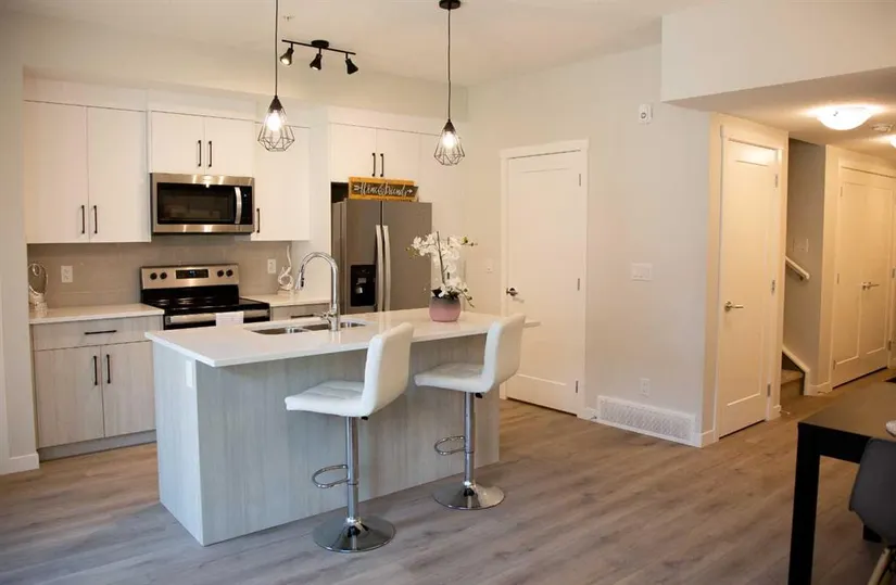 Sun-Filled South-Facing End Unit | Brand-New Furnished 2-Bedroom Townhome (2025 Build) You won’t want to miss this bright, south-facing end-unit townhome, filled with natural sunlight through expansive windows morning and afternoon. Built in 2025 and offered furnished, this exceptional home is ideal for professionals, a small family, or retirees seeking space, comfort, and low-maintenance living. Featuring 9’ ceilings on both floors, this home offers a spacious open-concept layout complemented by modern, upscale finishes. The sunlit main living area showcases quartz countertops, zebra blinds, two generous closets, and a large pantry—perfect for both everyday living and entertaining. Both bedrooms are generously sized, easily accommodating full bedroom furniture with room to spare. The primary bedroom includes a walk-in closet with direct ensuite access, while the second bedroom is equally spacious and flexible—ideal as a guest room/home office, or second bedroom. Second-floor in-suite laundry adds everyday convenience. The modern kitchen is fully equipped with a full-size refrigerator with water and ice dispenser, ideal for contemporary living. Enjoy stress-free living with no exterior maintenance required—snow removal, landscaping, and exterior upkeep are all taken care of, allowing you to simply move in and enjoy. Utilities included: Gas / Heat Water High-Speed Internet Parking Parking is conveniently located directly outside the back entrance, with an optional second underground parking stall available. Located in a prime, family-friendly community, this home is directly across from a large park, close to schools, shopping, and transit, and within walking distance to a new plaza currently under construction, including Tim Hortons and additional amenities. Commuters will appreciate the approximately 7-minute bus ride to the train station, offering quick and easy access to the rest of the city. One well-behaved pet permitted A rare opportunity to lease a brand-new, south-facing, furnished townhome with spacious bedrooms, no exterior maintenance, exceptional inclusions, and an unbeatable location. Contact today to arrange your private viewing.